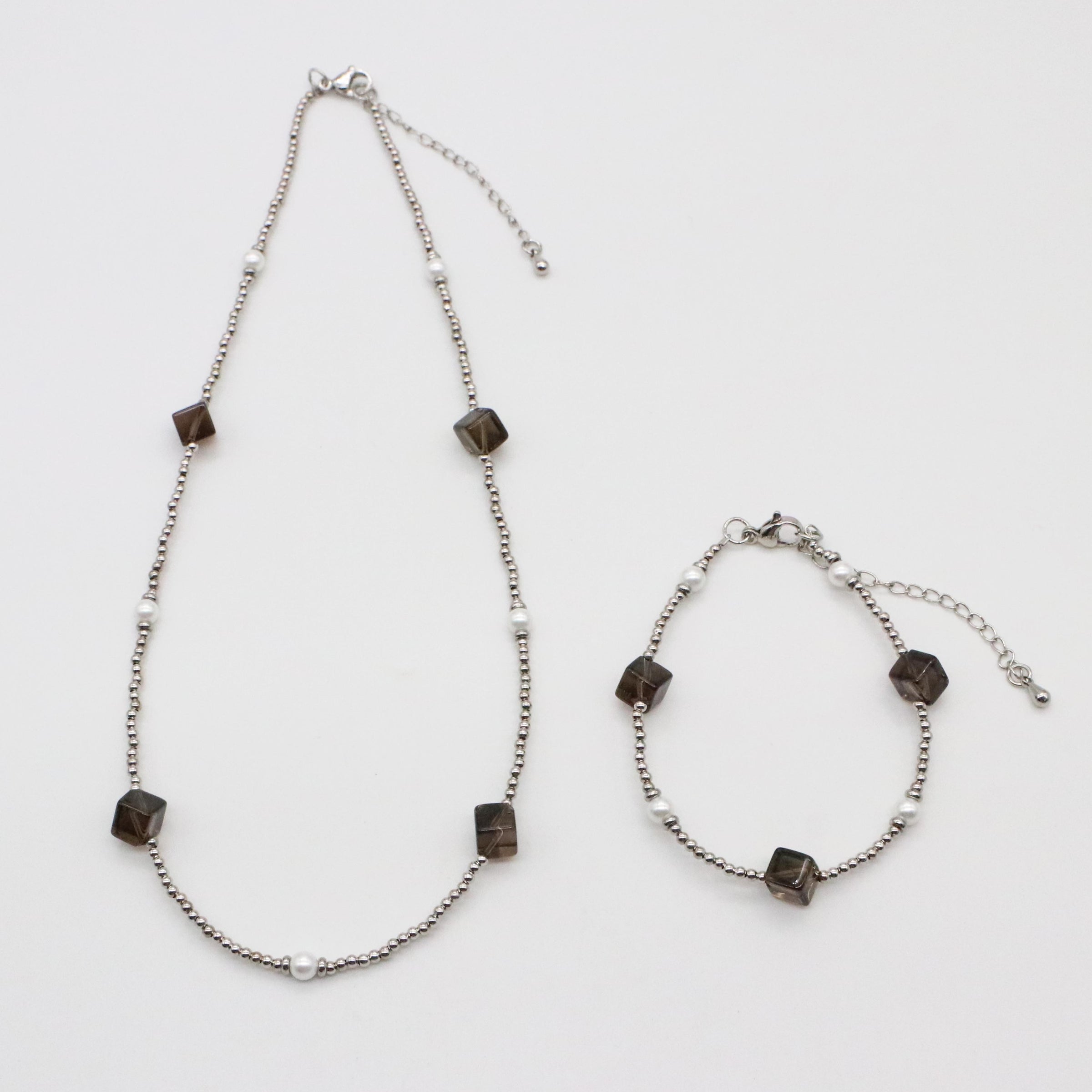 Fashion 6mm Squared Smoky Glass Beads Necklace & Bracelet Set