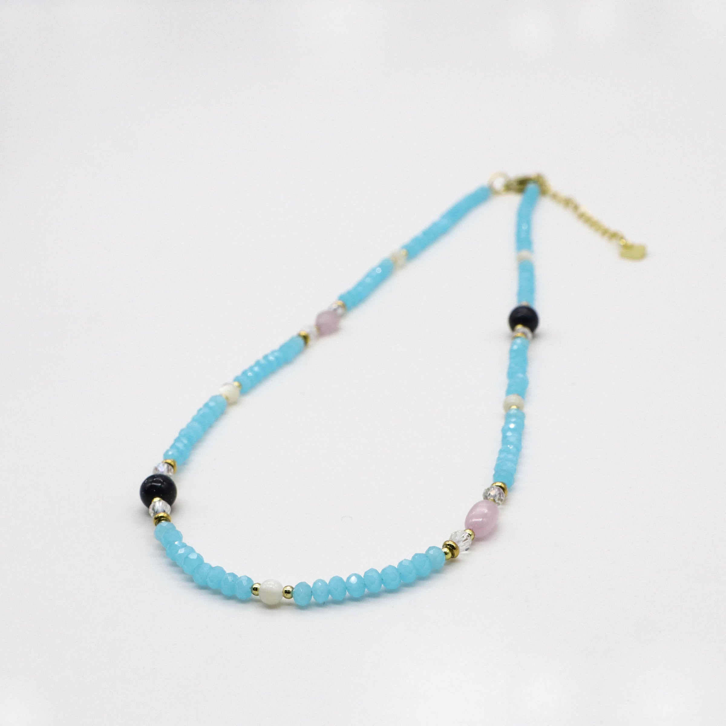 Material:3.5mm Mop Beads; 6mm Blue Sand Stone ; 5-8mm Irregular Rosequartz