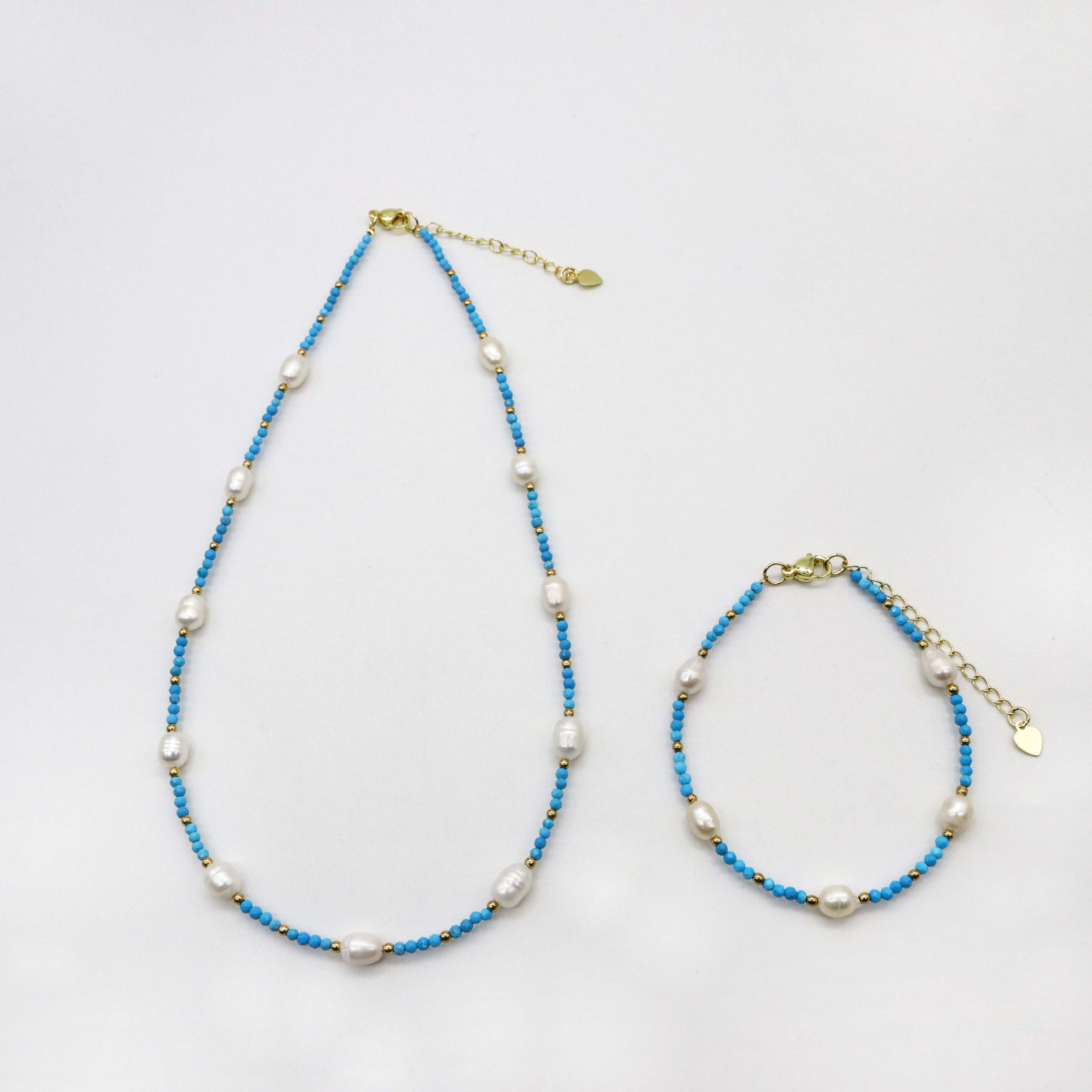 Fantastic Style 2mm Faceted Turquoise Pearls Necklace & Bracelet Set